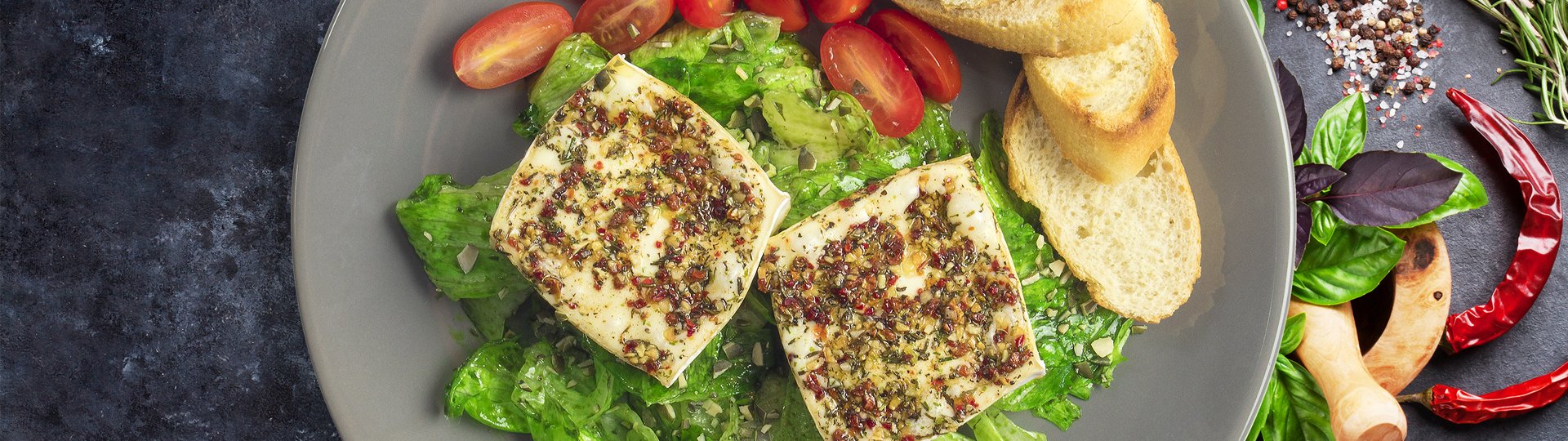 V misce smíchejte grilovací koření s 1-2 polévkovými lžícemi oleje. Sýr Olmín podélně rozkrojte a obě půlky obalte v připravené směsi. Obě půlky sýru položte na alobal nebo na grilovací tác rozkrojenou částí vzhůru a potřete zbylou kořenící směsí. Sýr pozvolna z jedné strany grilujte asi 8-12 minut. Sýry neotáčejte. Dobu a intenzitu grilování upravte podle zkušenosti s vlastním grilem.Po ukončení grilování dejte sýr opatrně na talíř. Při manipulaci nepoškoďte jeho kůrku, jinak sýr vyteče. Postup přípravy ledového salátu s dýňovým olejem: Do velké mísy natrháme důkladně opláchnutýledový salát. Osolíme a opepříme. Přidáme dýňový olej a nahrubo nasekaná dýňová semínka. Po promíchání ihned servírujeme. Na dozdobení použijeme cherry rajčátka.